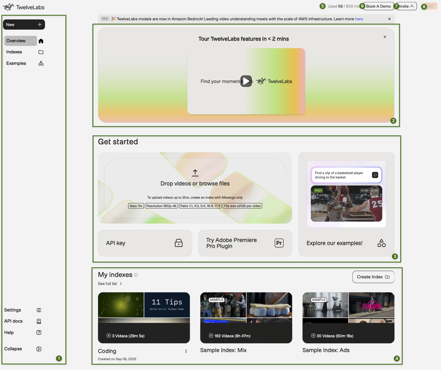 - Tour TwelveLabs features: Watch a brief introductory video showcasing the key capabilities of the platform.