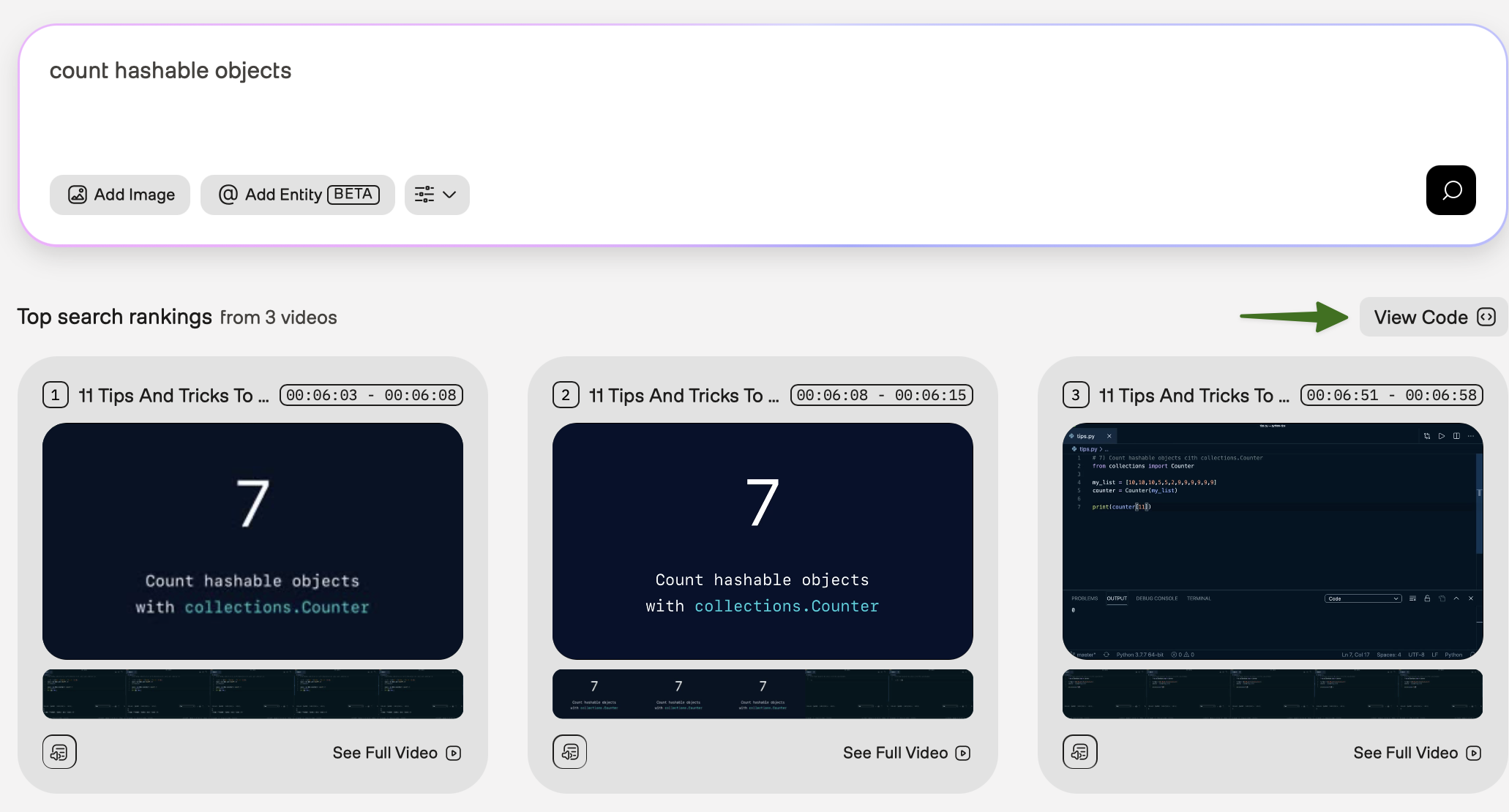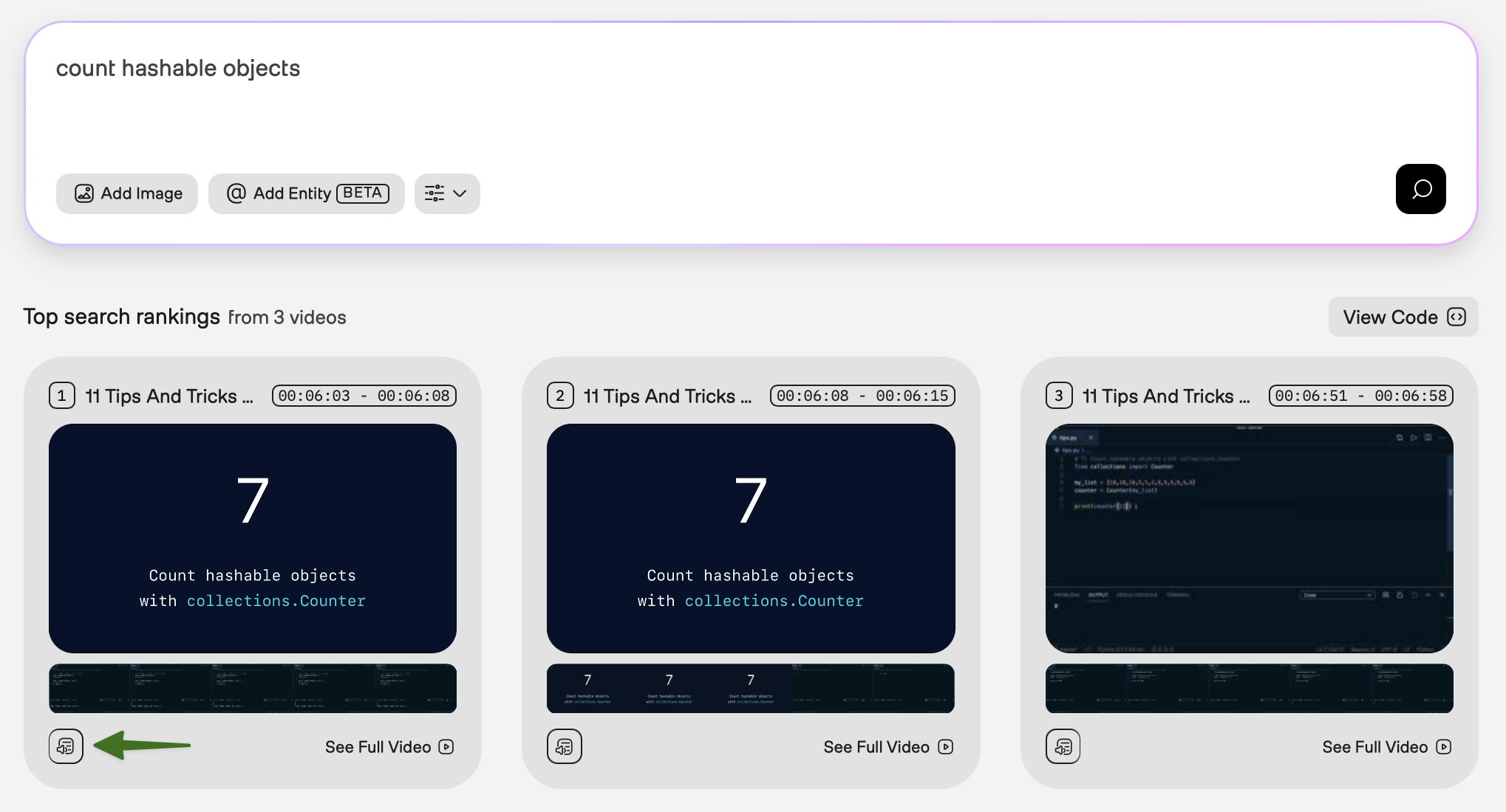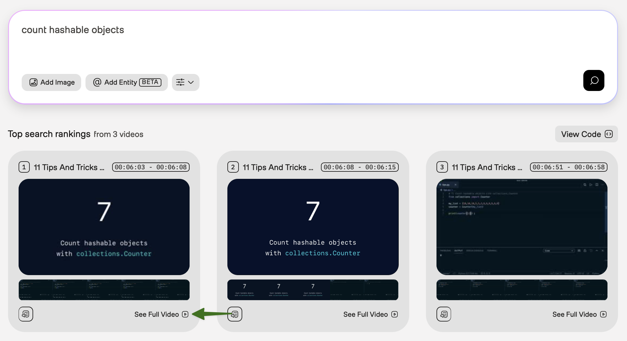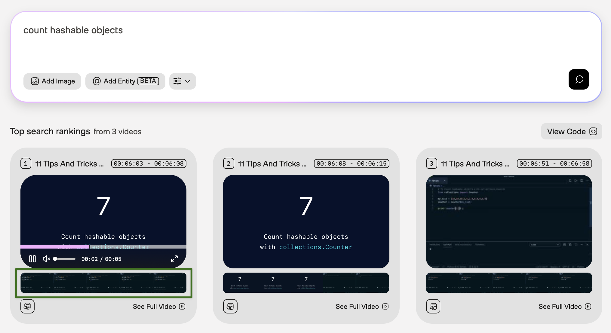 You can preview specific moments in search results, view transcriptions, see all matching clips from a video, or view the code snippet that the platform used to perform the request.